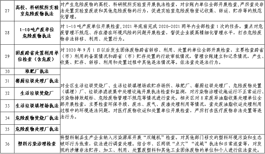 加强对化工、制药、汽车、电子等重点行业,危险废物经营单位、固体废物跨省转移、利用、处置单位、产废企业及高校和科研院所实验室、固体废物集中处理设施、塑料制品生产企业、辐射企业等重点单位开展执法检查,重点核查固体废物跨省(市)利用的备案情况和跨省(市)贮存处置行政审批及管理台账建立、记录情况,危险废物非法转移、利用、处置等环节,实验室危险废物管理不规范、实验室废液随意倾倒等潜在生态环境风险,污染物治理设施不正常运行、污染物排放超标、危险废物管理不规范、非法贮存、加工、利用、处置废塑料等情况进行查处;重点查处医疗机构医疗废物非法处置、转移等违法行为,确保医废规范转运。加大辐射企业安全监管检查频次,依法开展现场调查,规范查处辐射环境违法问题。做好生态环境噪声信访处置工作,加强中高考期间噪声“绿色护考”专项执法工作,保障考点及周边声环境质量。