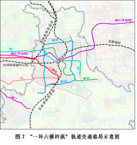 构建以城市副中心为交通枢纽门户的对外综合交通体系,打造不同层级轨道为主、多种交通方式协调共存的复合型交通走廊。建成站城一体的城市副中心综合交通枢纽,完成城市副中心从末端交通向枢纽型交通的转变。实现22号线(平谷线)、京唐城际等一批线路通车运行,全面提升向北三县与京津冀地区的对外服务功能和辐射能力。加强“一核两翼”协同发展,增强与中心城的快速交通联系,新建城市副中心轨道线网,提升轨道交通服务能力,改造提升市郊铁路城市副中心线全线复线并东延至燕郊站,整体提升通密线,实现1号线与八通线无缝换乘,建成17号线(城市副中心段)和6号线南延,M101线达到通车条件,储备M102线、M103线和M104线。到“十四五”期末,初步形成“一环六横四纵”的轨道交通格局(图2所示)。