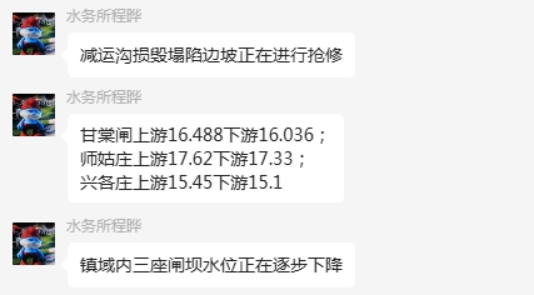 镇水务部门全员“在岗、在职、在责、在状态”,镇村两级河长共出动163人次,对我镇管护的25条河道持续进行检查排查,实时监测水位状况并及时上报,劝离游玩、钓鱼的村民共计78人。在巡查过程中,工作人员发现减运沟西堡桥北坡发生塌陷,立即上报区水务局并联系施工单位金河水务进行管控抢修处理。