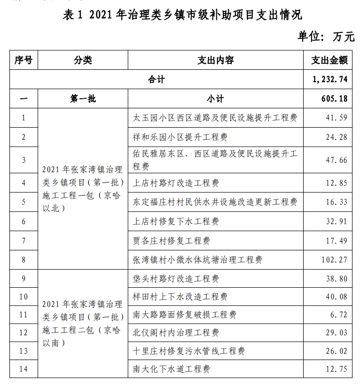 2021年张家湾镇治理类乡镇项目资金共计1232.74万元,均为市级资金,2022年度全部支出。 |