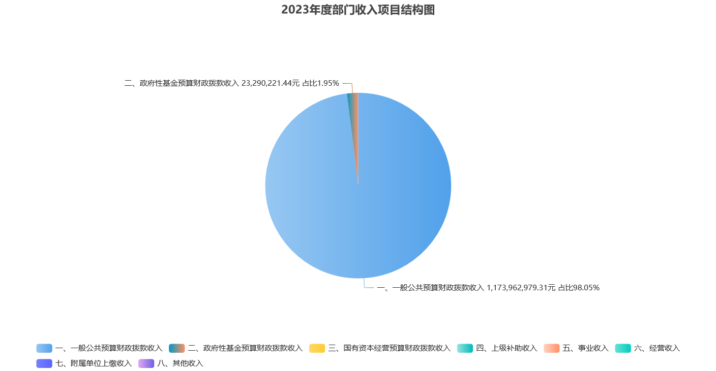1.财政拨款收入119725.32万元,占收入合计的100%。其中:一般公共预算财政拨款收入117396.30万元,占收入合计的98.05%;政府性基金预算财政拨款收入2329.02万元,占收入合计的1.94%;国有资本经营预算财政拨款收入0万元,占收入合计的0%;