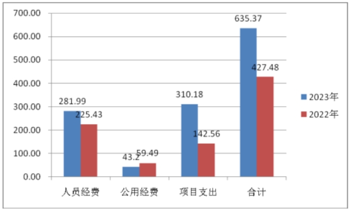 2023年度本年支出合计635.37万元,比上年增加204.51万元,增长47.47%,其中:基本支出325.19万元,占支出合计的51.18%;项目支出310.18万元,占支出合计的48.81%;上缴上级支出0万元,占支出合计的0%;经营支出0万元,占支出合计的0%;对附属单位补助支出0万元,占支出合计的0%。