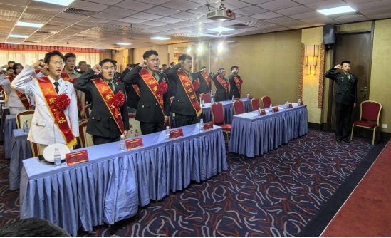 随后,与会领导为退役士兵代表佩戴象征荣誉的绶带和红花,全体人员在领誓人俞福旺的带领下铿锵宣读《退役誓词》。