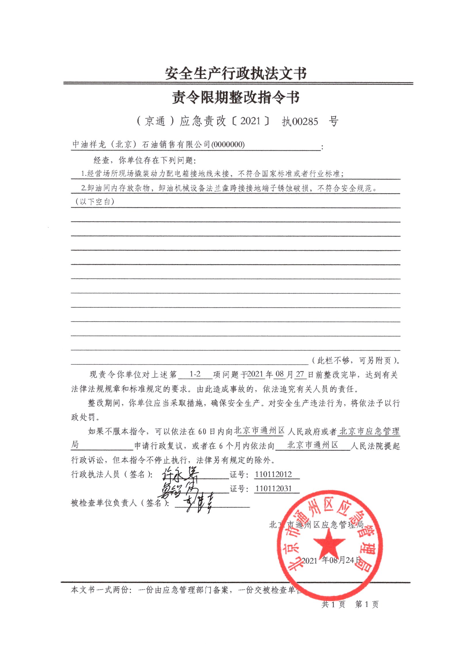 关于对中油祥龙(北京)石油销售有限公司的责令限期整改情况