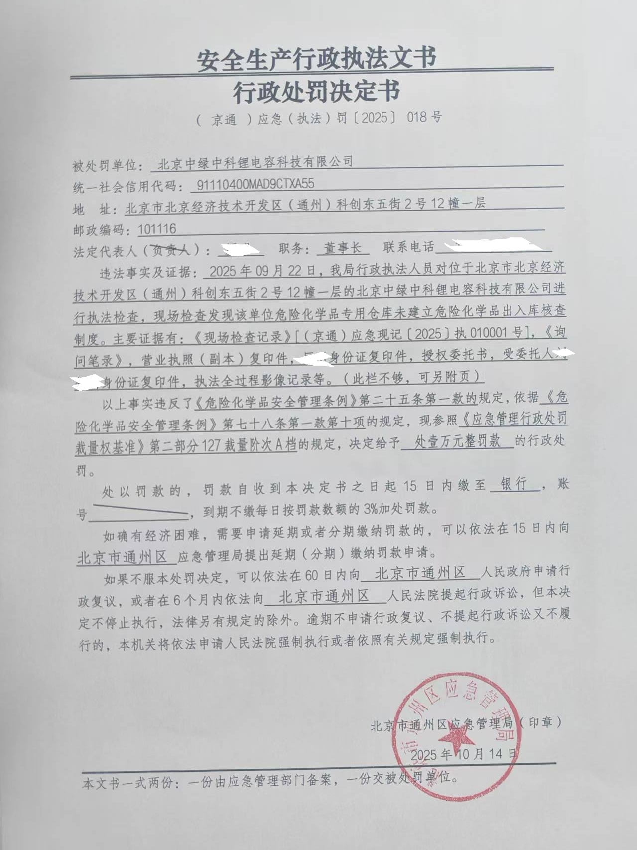 关于对北京中绿中科锂电容科技有限公司的行政处罚决定情况