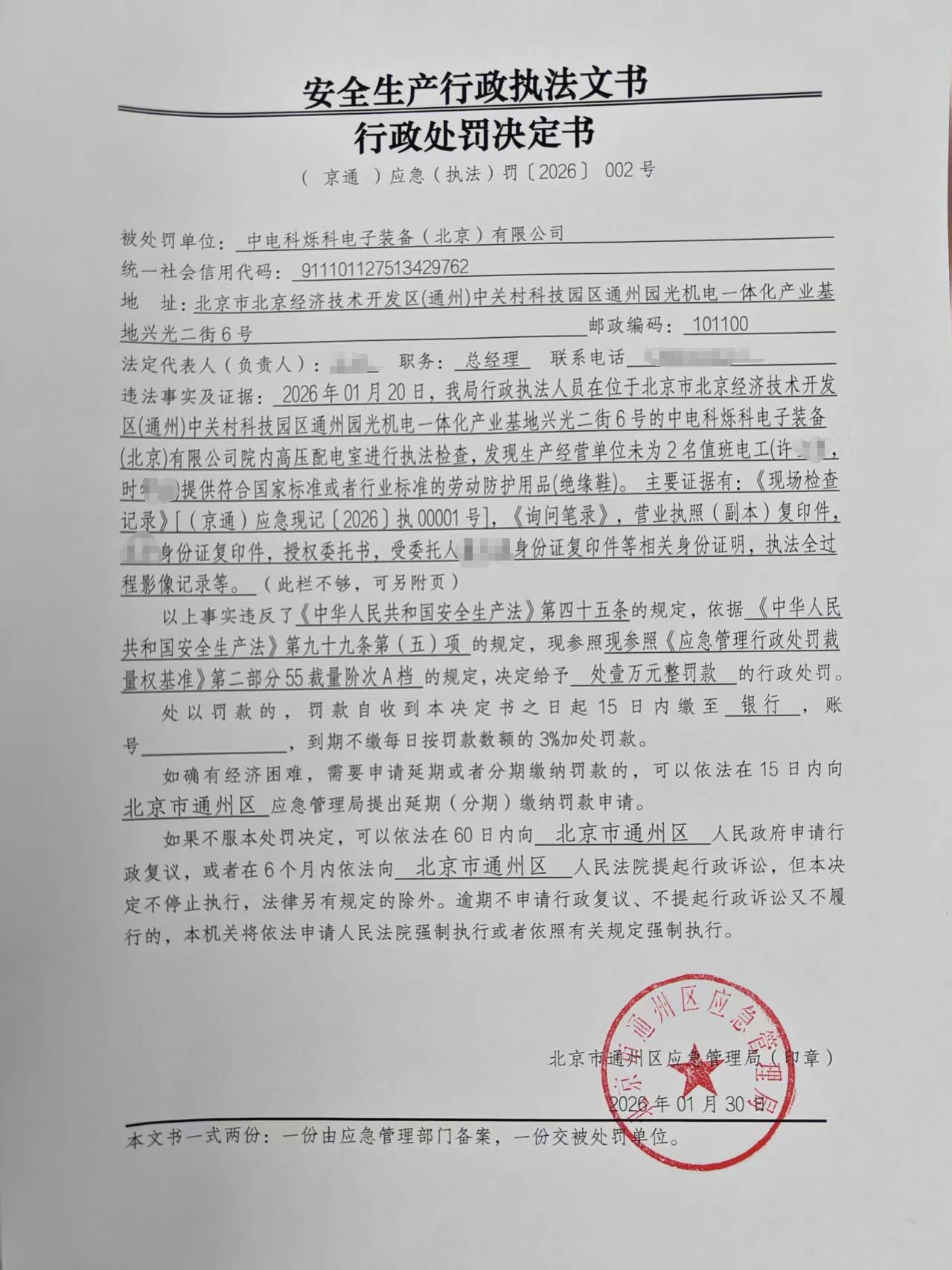 关于对中电科烁科电子装备(北京)有限公司的行政处罚决定情况