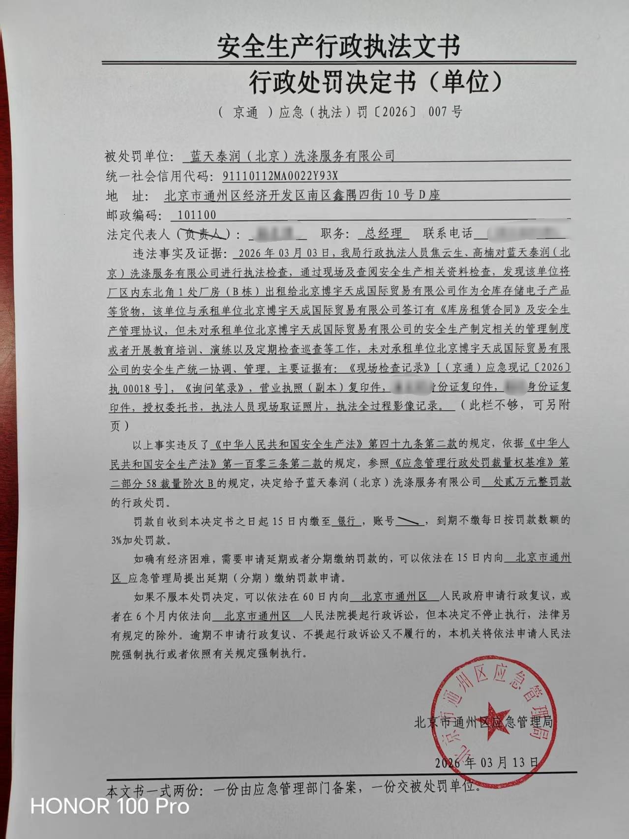 关于对蓝天泰润(北京)洗涤服务有限公司的行政处罚决定情况