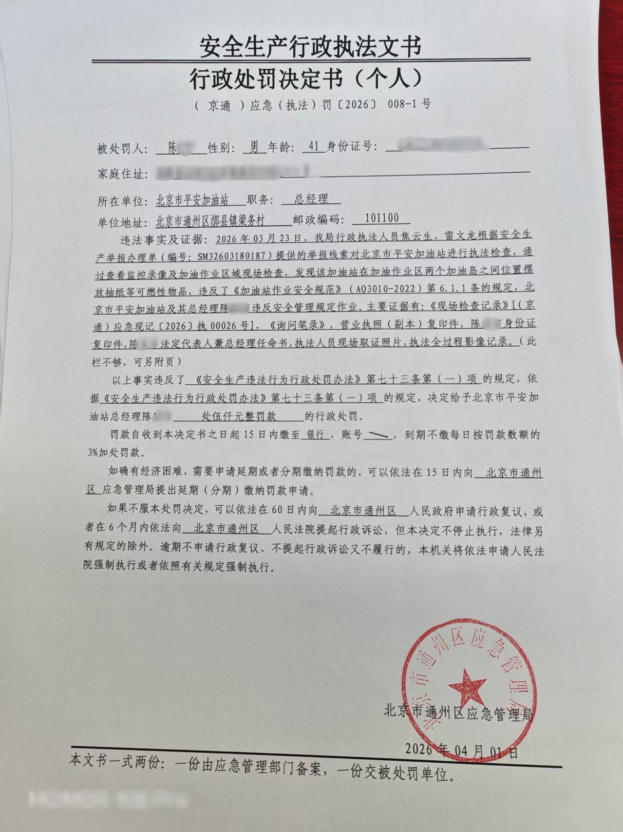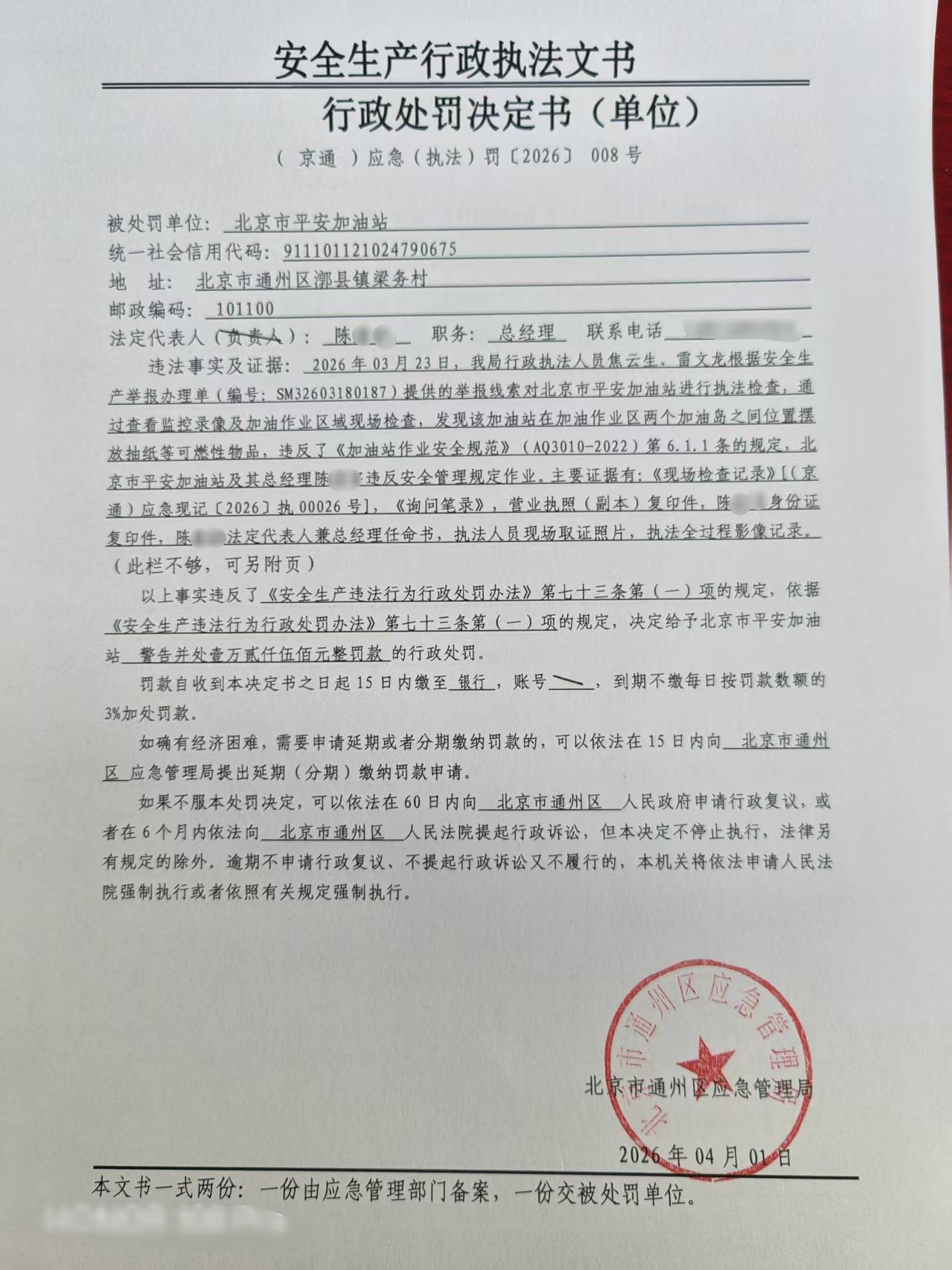 关于对北京市平安加油站的行政处罚决定情况