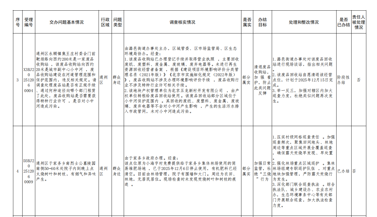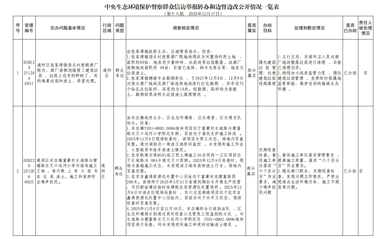 2025年12月7日,中央第一生态环境保护督察组向北京市交办第十八批群众信访举报件37件(其中2件依据有关规定不予公开),涉及通州区4件,现按要求向社会公开该批次《中央生态环境保护督察群众信访举报转办和边督边改公开情况一览表》(见下表)。