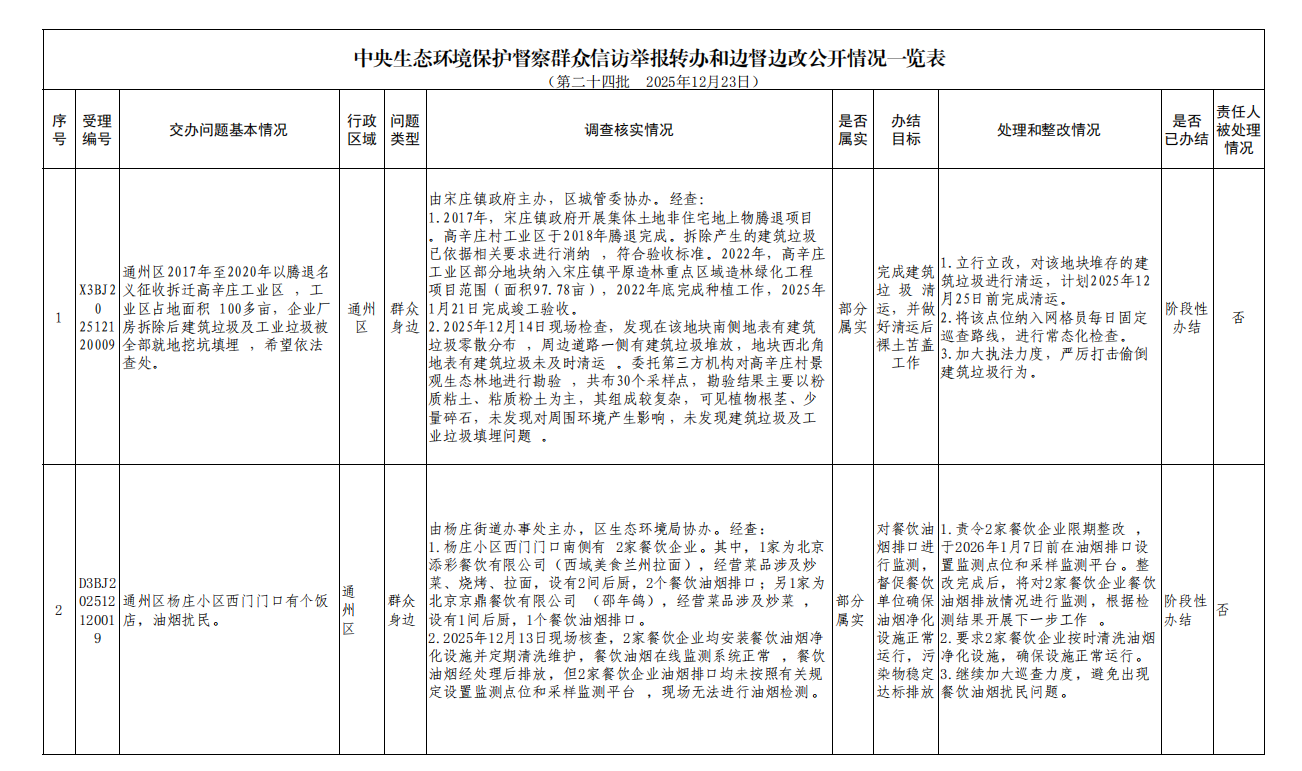 2025年12月13日,中央第一生态环境保护督察组向北京市交办第二十四批群众信访举报件34件,涉及通州区3件,现按要求向社会公开该批次《中央生态环境保护督察群众信访举报转办和边督边改公开情况一览表》(见下表)。