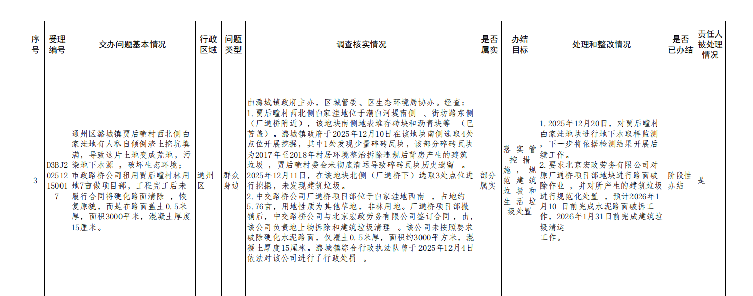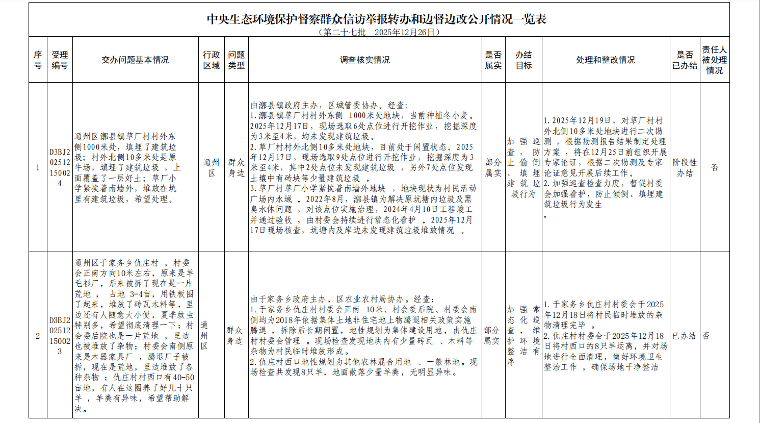 2025年12月16日,中央第一生态环境保护督察组向北京市交办第二十七批群众信访举报件33件,涉及通州区3件,现按要求向社会公开该批次《中央生态环境保护督察群众信访举报转办和边督边改公开情况一览表》(见下表)。