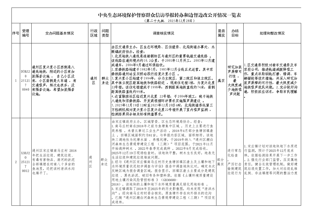 2025年12月18日,中央第一生态环境保护督察组向北京市交办第二十九批群众信访举报件35件(其中1件依据有关规定不予公开),涉及通州区2件,现按要求向社会公开该批次《中央生态环境保护督察群众信访举报转办和边督边改公开情况一览表》(见下表)。