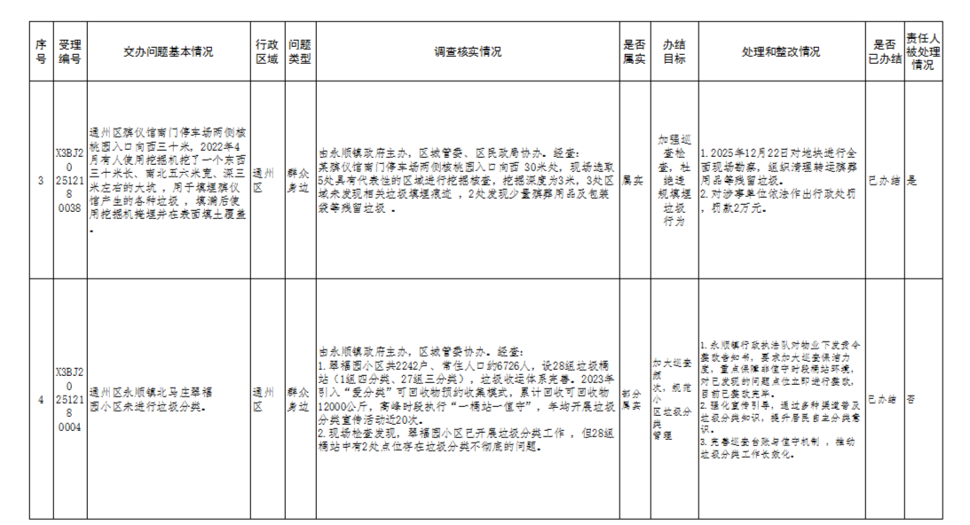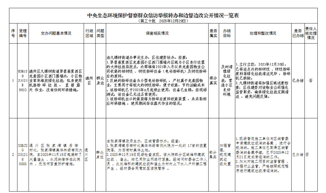 2025年12月19日,中央第一生态环境保护督察组向北京市交办第三十批群众信访举报件33件(其中1件依据有关规定不予公开),涉及通州区4件,现按要求向社会公开该批次《中央生态环境保护督察群众信访举报转办和边督边改公开情况一览表》(见下表)。