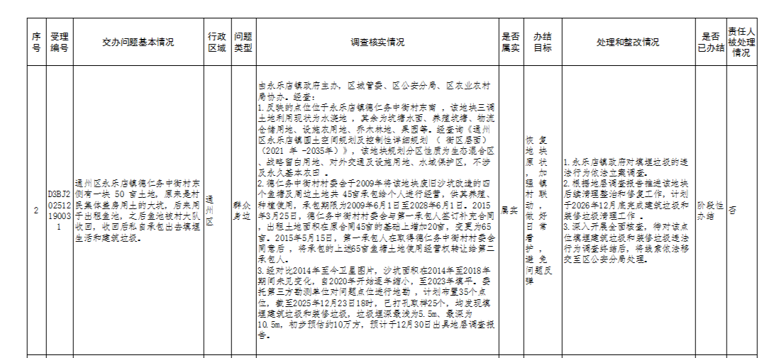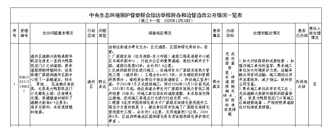 2025年12月20日,中央第一生态环境保护督察组向北京市交办第三十一批群众信访举报件33件,涉及通州区2件,现按要求向社会公开该批次《中央生态环境保护督察群众信访举报转办和边督边改公开情况一览表》(见下表)。