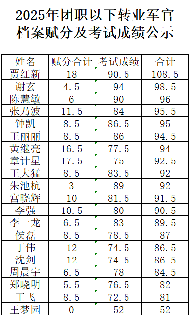 2025年团职以下转业军官档案赋分与考试成绩公示