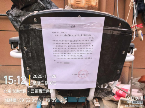 经查,位于九棵树街道云景西里南区42号楼1单元小区蓝色电动三轮的车辆,涉嫌违反《北京市市容环境卫生条例》第三十五条规定,请您对该车辆自行清理和处置,共同维护良好的城市环境秩序。