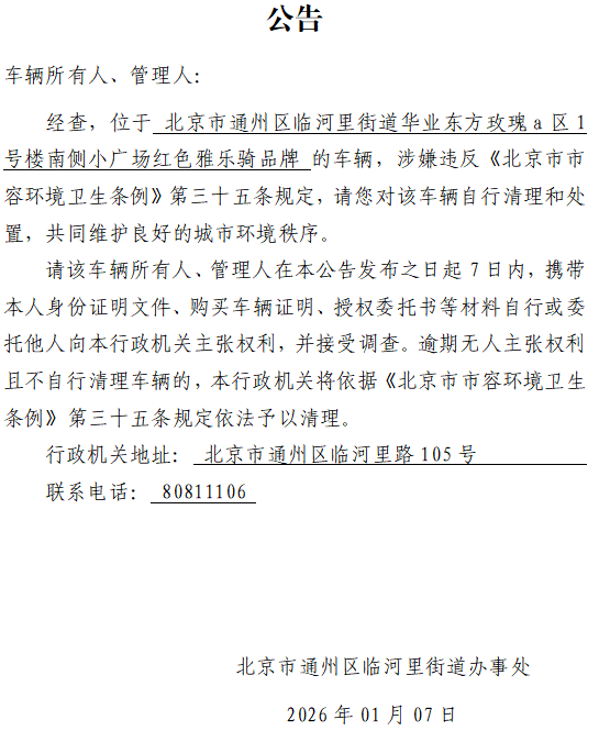 北京市通州区临河里街道办事处废弃非机动车公告15