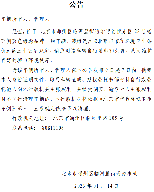 北京市通州区临河里街道办事处废弃非机动车公告42