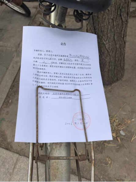 经查,位于北京市通州区潞源街道高法项目西侧的自行车,品牌:尼柯达,颜色:灰,车牌:无 ,电池:无,涉嫌违反《北京市市容环境卫生条例》第三十五条规定,请您对该车辆自行清理和处置,共同维护良好的城市环境秩序。