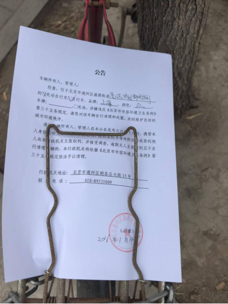 经查,位于北京市通州区潞源街道高法项目西侧的自行车,品牌:上海,颜色:红,车牌:无 ,电池:无,涉嫌违反《北京市市容环境卫生条例》第三十五条规定,请您对该车辆自行清理和处置,共同维护良好的城市环境秩序。