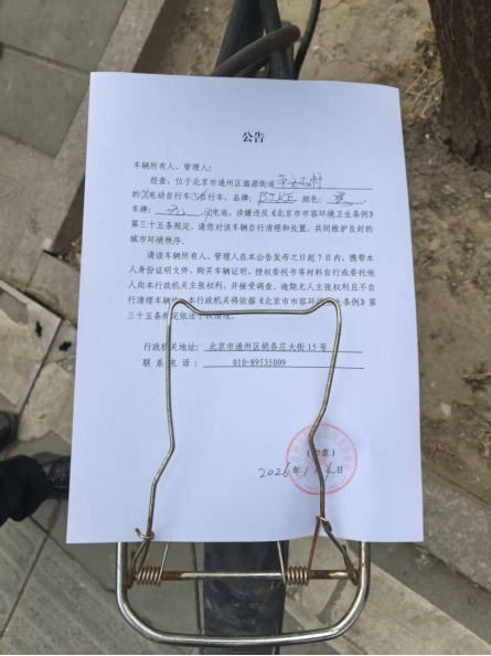 经查,位于北京市通州区潞源街道新安屯村的自行车,品牌:BIKE,颜色:黑,车牌:无 ,电池:无,涉嫌违反《北京市市容环境卫生条例》第三十五条规定,请您对该车辆自行清理和处置,共同维护良好的城市环境秩序。