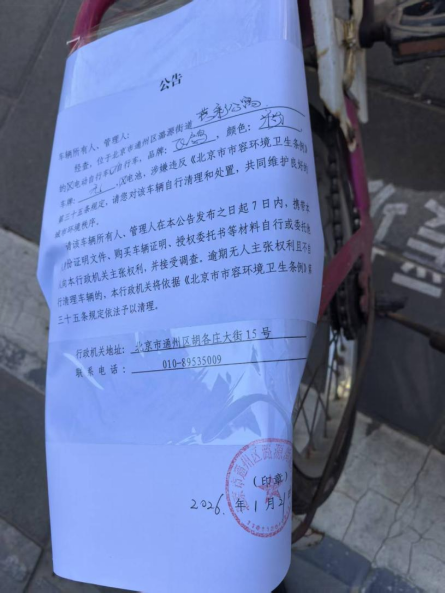 经查,位于北京市通州区潞源街道燕彩公寓的自行车,品牌:飞鸽,颜色:粉,车牌:无 ,电池:无,涉嫌违反《北京市市容环境卫生条例》第三十五条规定,请您对该车辆自行清理和处置,共同维护良好的城市环境秩序。