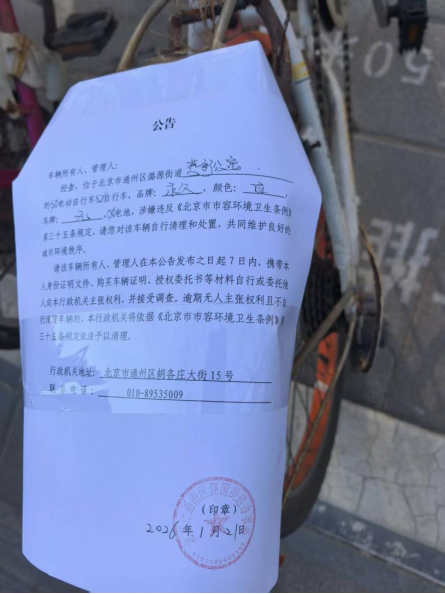 经查,位于北京市通州区潞源街道燕彩公寓的自行车,品牌:永久,颜色:白,车牌:无 ,电池:无,涉嫌违反《北京市市容环境卫生条例》第三十五条规定,请您对该车辆自行清理和处置,共同维护良好的城市环境秩序。
