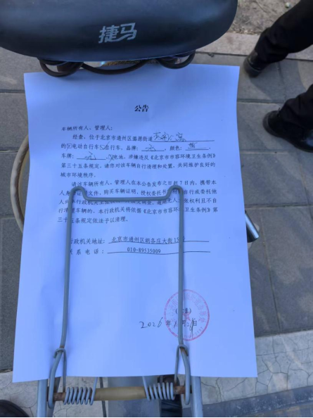 经查,位于北京市通州区潞源街道燕彩公寓的自行车,品牌:无,颜色:蓝,车牌:无 ,电池:无,涉嫌违反《北京市市容环境卫生条例》第三十五条规定,请您对该车辆自行清理和处置,共同维护良好的城市环境秩序。