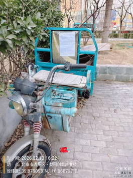 经查,位于梨园创意产业楼浩瀚机车汇前绿色双吉无牌电动三轮车(无电池) 的车辆,涉嫌违反《北京市市容环境卫生条例》第三十五条规定,请您对该车辆自行清理和处置,共同维护良好的城市环境秩序。