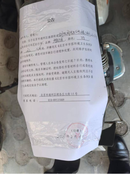 经查,位于北京市通州区潞源街道古月佳园东区5号楼3单元北侧的电动自行车,品牌:雅迪,颜色:白,车牌:无 ,电池:有,涉嫌违反《北京市市容环境卫生条例》第三十五条规定,请您对该车辆自行清理和处置,共同维护良好的城市环境秩序。