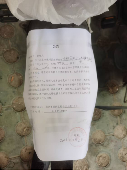 经查,位于北京市通州区潞源街道古月佳园西区20号楼南侧的电动自行车,品牌:踏浪,颜色:黑,车牌:无,电池:有,涉嫌违反《北京市市容环境卫生条例》第三十五条规定,请您对该车辆自行清理和处置,共同维护良好的城市环境秩序。