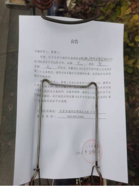 经查,位于北京市通州区潞源街道地铁6号线东夏园站B口的自行车,品牌:无,颜色:蓝,车牌:无,电池:无,涉嫌违反《北京市市容环境卫生条例》第三十五条规定,请您对该车辆自行清理和处置,共同维护良好的城市环境秩序。