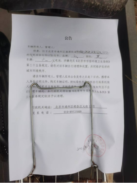 经查,位于北京市通州区潞源街道地铁6号线东夏园站B口的自行车,品牌:无,颜色:黑,车牌:无,电池:无,涉嫌违反《北京市市容环境卫生条例》第三十五条规定,请您对该车辆自行清理和处置,共同维护良好的城市环境秩序。