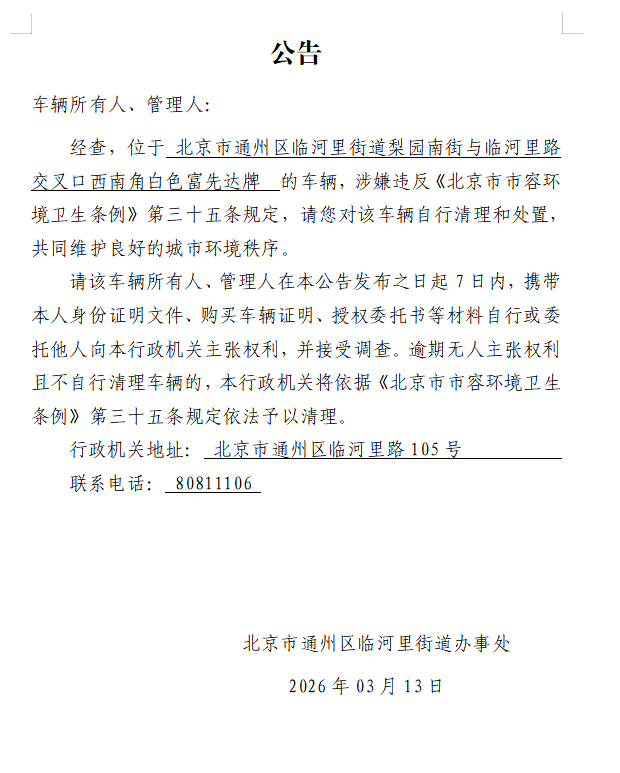 北京市通州区临河里街道办事处废弃非机动车公告48