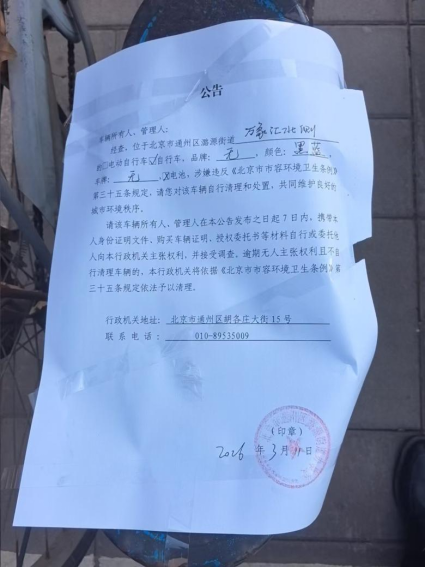 经查,位于北京市通州区潞源街道万象汇北侧的自行车,品牌:无,颜色:黑色+蓝色,车牌:无,电池:无,涉嫌违反《北京市市容环境卫生条例》第三十五条规定,请您对该车辆自行清理和处置,共同维护良好的城市环境秩序。