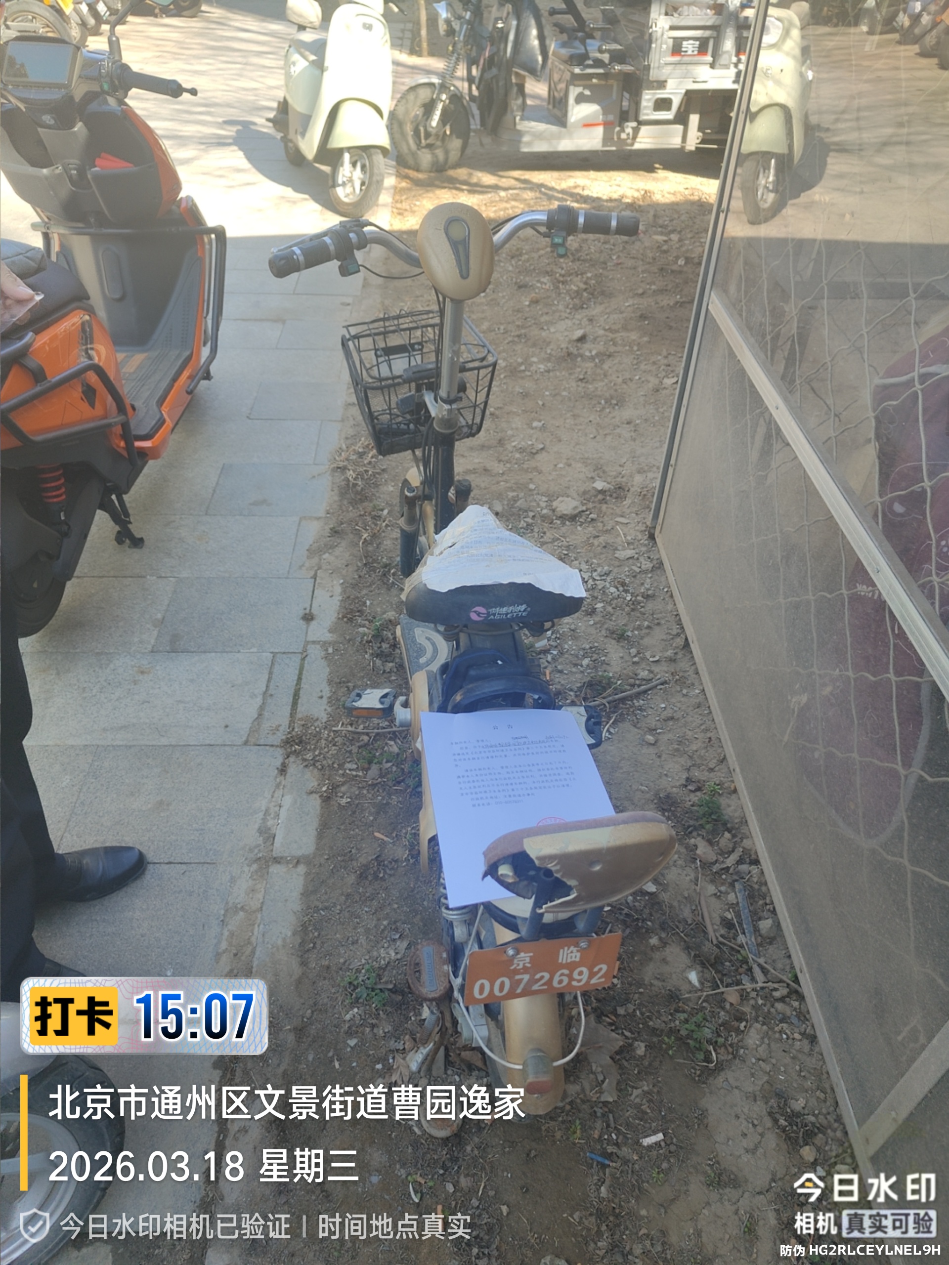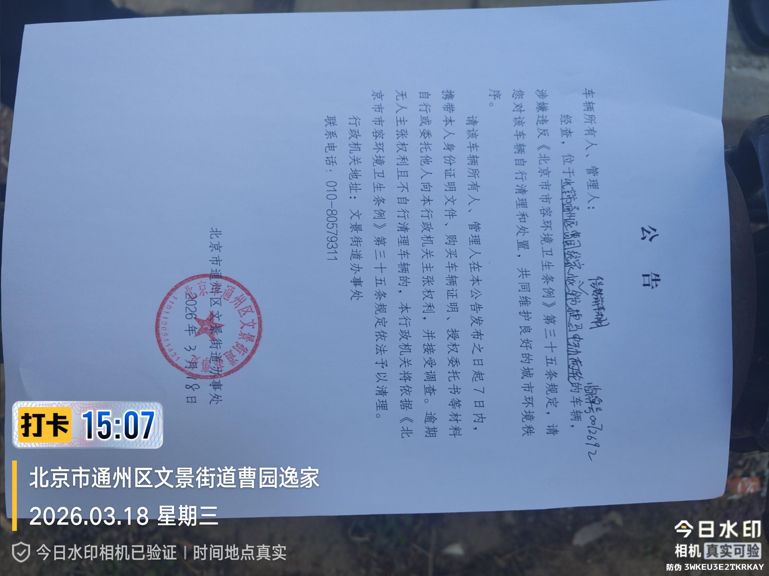 经查,位于北京市通州区曹园逸家小区9号楼前车棚金色捷马电动两轮,临牌0072692的车辆,涉嫌违反《北京市市容环境卫生条例》第三十五条规定,请您对该车辆自行清理和处置,共同维护良好的城市环境秩序。