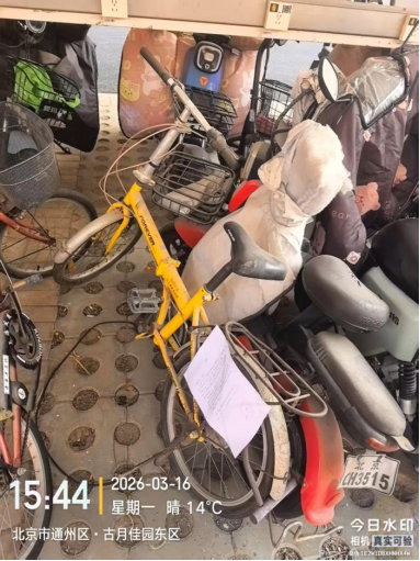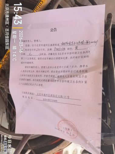 经查,位于北京市通州区潞源街道古月佳园东区4号楼2单元北侧的自行车,品牌:FOREVER,颜色:黄色,车牌:无,电池:无,涉嫌违反《北京市市容环境卫生条例》第三十五条规定,请您对该车辆自行清理和处置,共同维护良好的城市环境秩序。