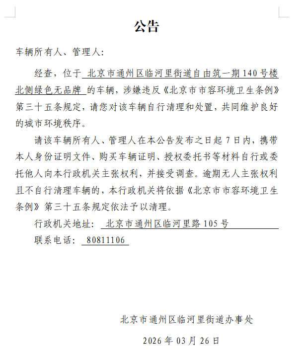 北京市通州区临河里街道办事处废弃非机动车公告51