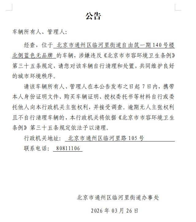 北京市通州区临河里街道办事处废弃非机动车公告54