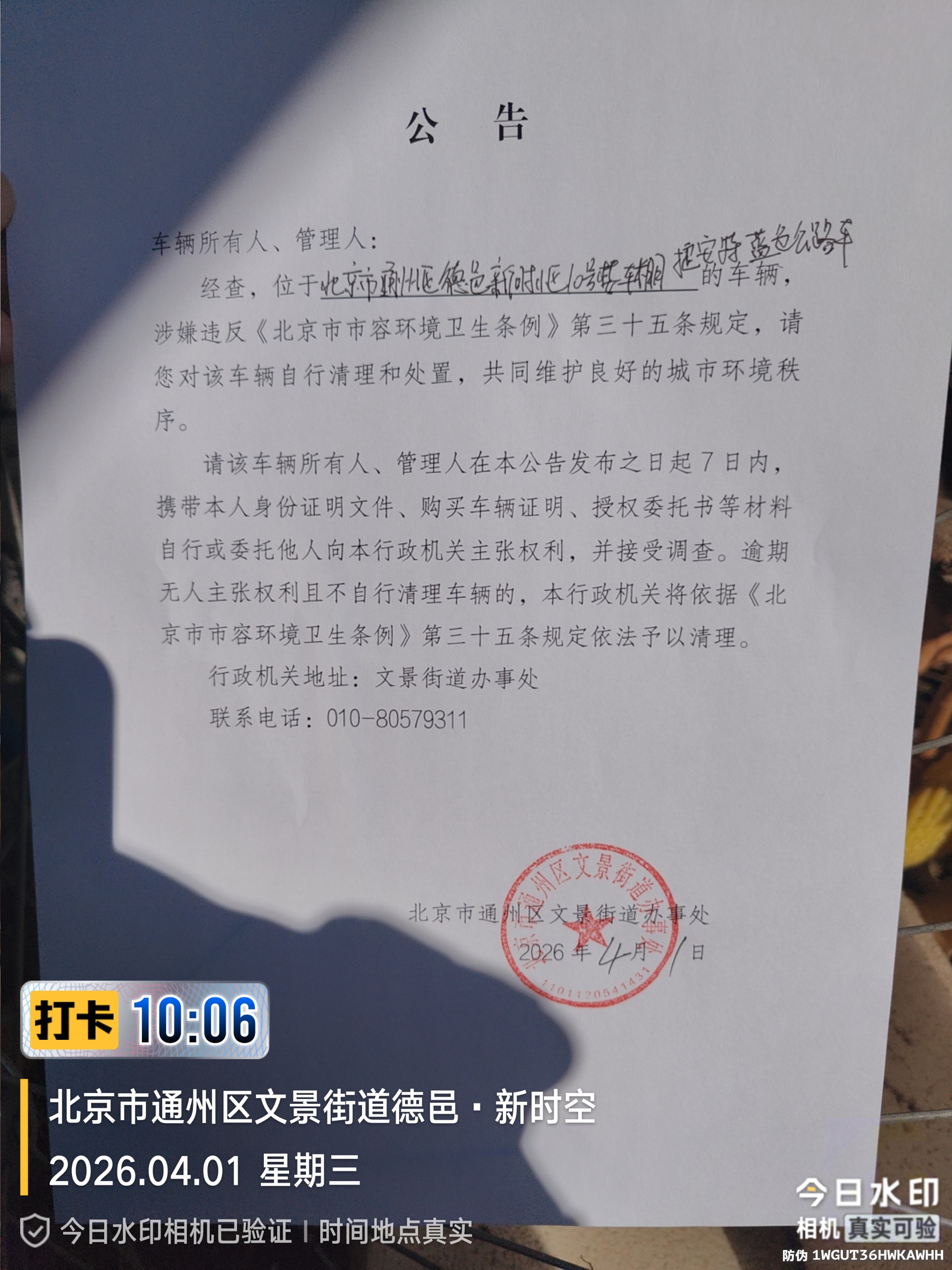 请该车辆所有人、管理人在本公告发布之日起7日内,携带本人身份证明文件、购买车辆证明、授权委托书等材料自行或委托他人向本行政机关主张权利,并接受调查。逾期无人主张权利且不自行清理车辆的,本行政机关将依据《北京市市容环境卫生条例》第三十五条规定依法予以清理。