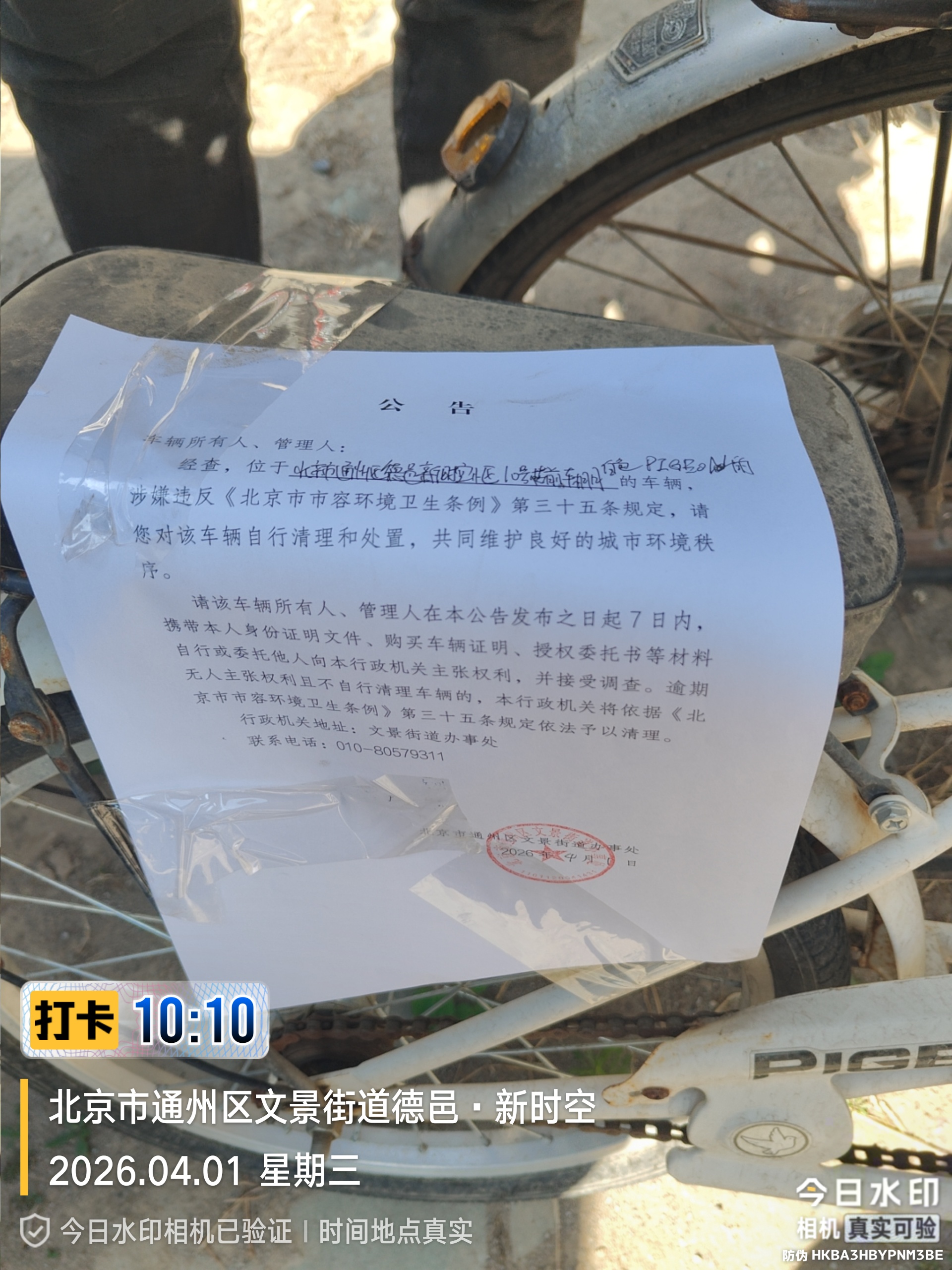 经查,位于北京市通州区德邑新时空小区10号楼前车棚白色PIGEON牌的自行车,涉嫌违反《北京市市容环境卫生条例》第三十五条规定,请您对该车辆自行清理和处置,共同维护良好的城市环境秩序。