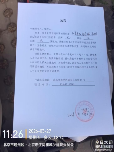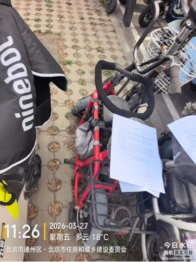 经查,位于北京市通州区潞源街道北京市政府3号楼车棚内的电动自行车,品牌:无,颜色:红色,车牌:无,电池:无,涉嫌违反《北京市市容环境卫生条例》第三十五条规定,请您对该车辆自行清理和处置,共同维护良好的城市环境秩序。
