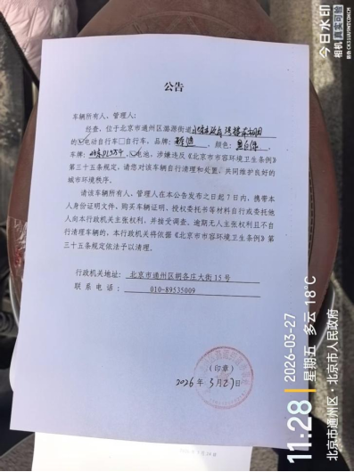 北京市通州区潞源街道办事处清理废弃非机动车公告142