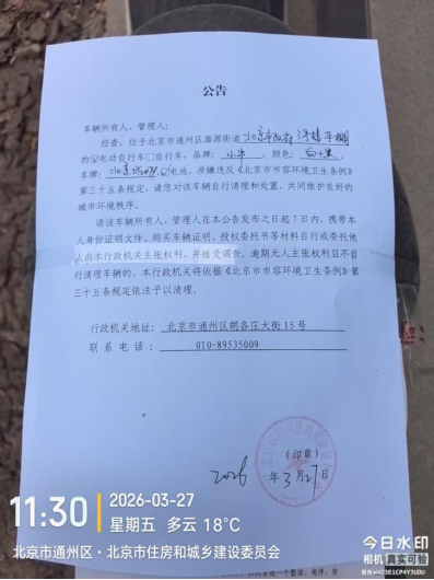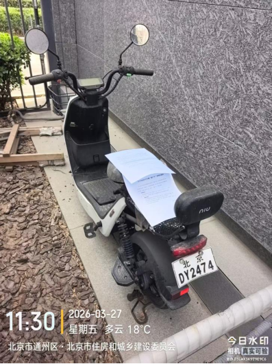 经查,位于北京市通州区潞源街道北京市政府3号楼车棚内的电动自行车品牌:小牛颜色:+黑色,车牌:北京DY2474,电池:有涉嫌违反《北京市市容环境卫生条例》第三十五条规定,请您对该车辆自行清理和处置,共同维护良好的城市环境秩序。