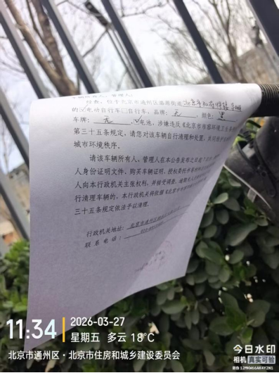 经查,位于北京市通州区潞源街道北京市政府4号楼车棚内的电动自行车,品牌:无,颜色:黑色,车牌:无,电池:有,涉嫌违反《北京市市容环境卫生条例》第三十五条规定,请您对该车辆自行清理和处置,共同维护良好的城市环境秩序。