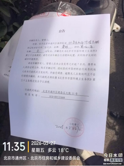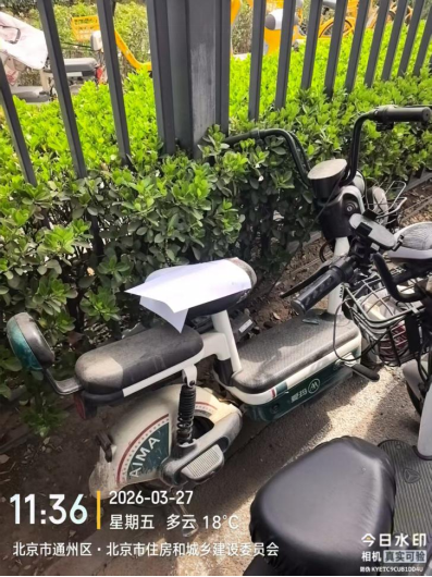 经查,位于北京市通州区潞源街道北京市政府4号楼车棚内的电动自行车,品牌:爱玛,颜色:黑色+白色+绿色,车牌:无,电池:有,涉嫌违反《北京市市容环境卫生条例》第三十五条规定,请您对该车辆自行清理和处置,共同维护良好的城市环境秩序。
