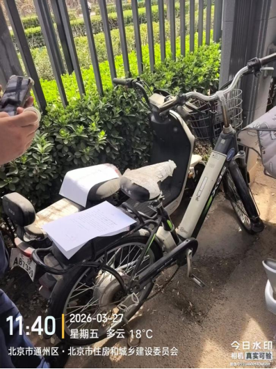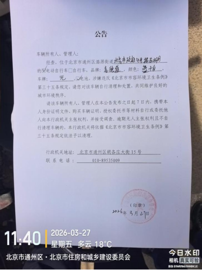 经查,位于北京市通州区潞源街道北京市政府4号楼车棚内的电动自行车,品牌:喜德盛,颜色:蓝色+白色,车牌:无,电池:有,涉嫌违反《北京市市容环境卫生条例》第三十五条规定,请您对该车辆自行清理和处置,共同维护良好的城市环境秩序。