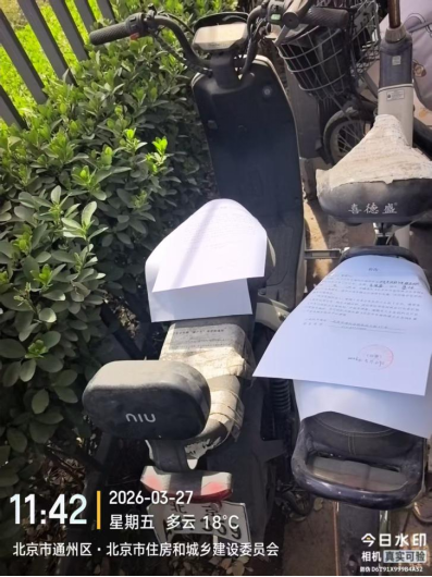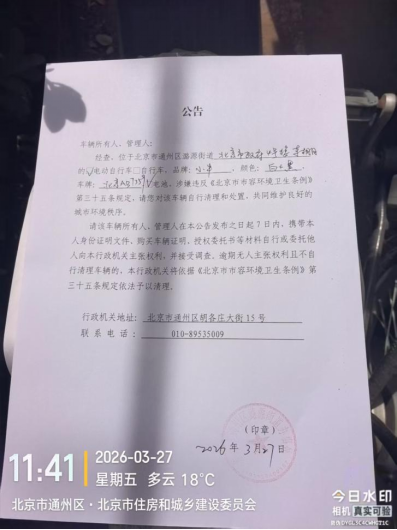 经查,位于北京市通州区潞源街道北京市政府4号楼车棚内的电动自行车,品牌:小牛,颜色:白色+黑色,车牌:北京AB7359,电池:有,涉嫌违反《北京市市容环境卫生条例》第三十五条规定,请您对该车辆自行清理和处置,共同维护良好的城市环境秩序。