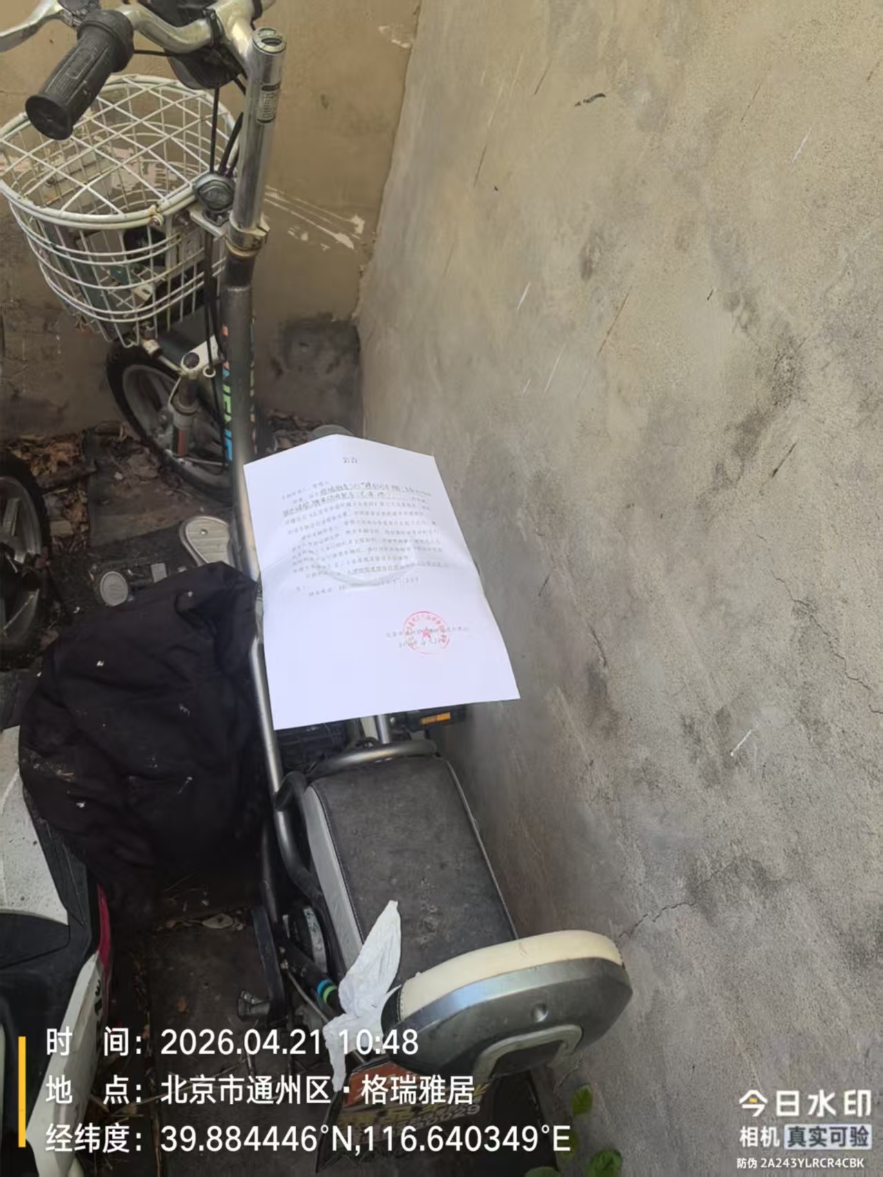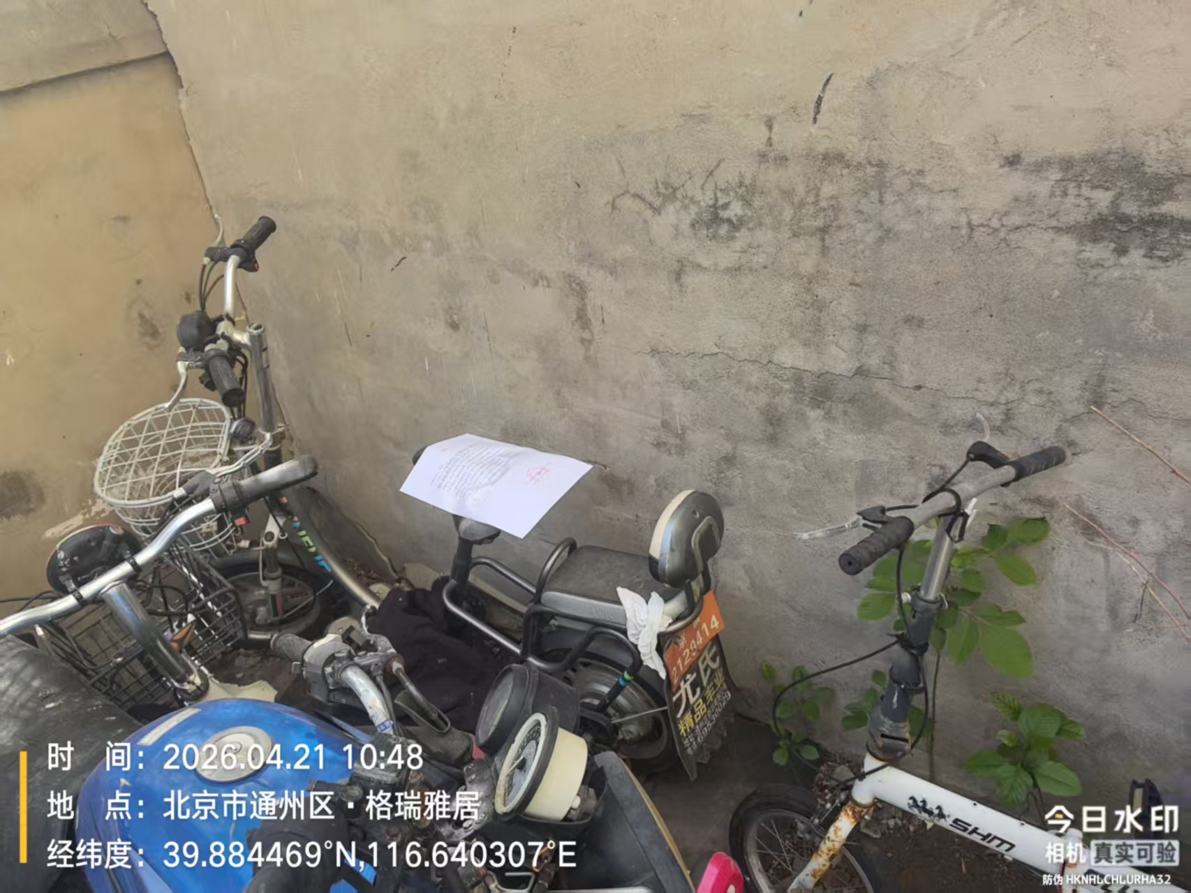 经查,位于格瑞雅居205号楼东侧车棚(京临2125414)银色绿能牌电动两轮车(无电池)的车辆,涉嫌违反《北京市市容环境卫生条例》第三十五条规定,请您对该车辆自行清理和处置,共同维护良好的城市环境秩序。