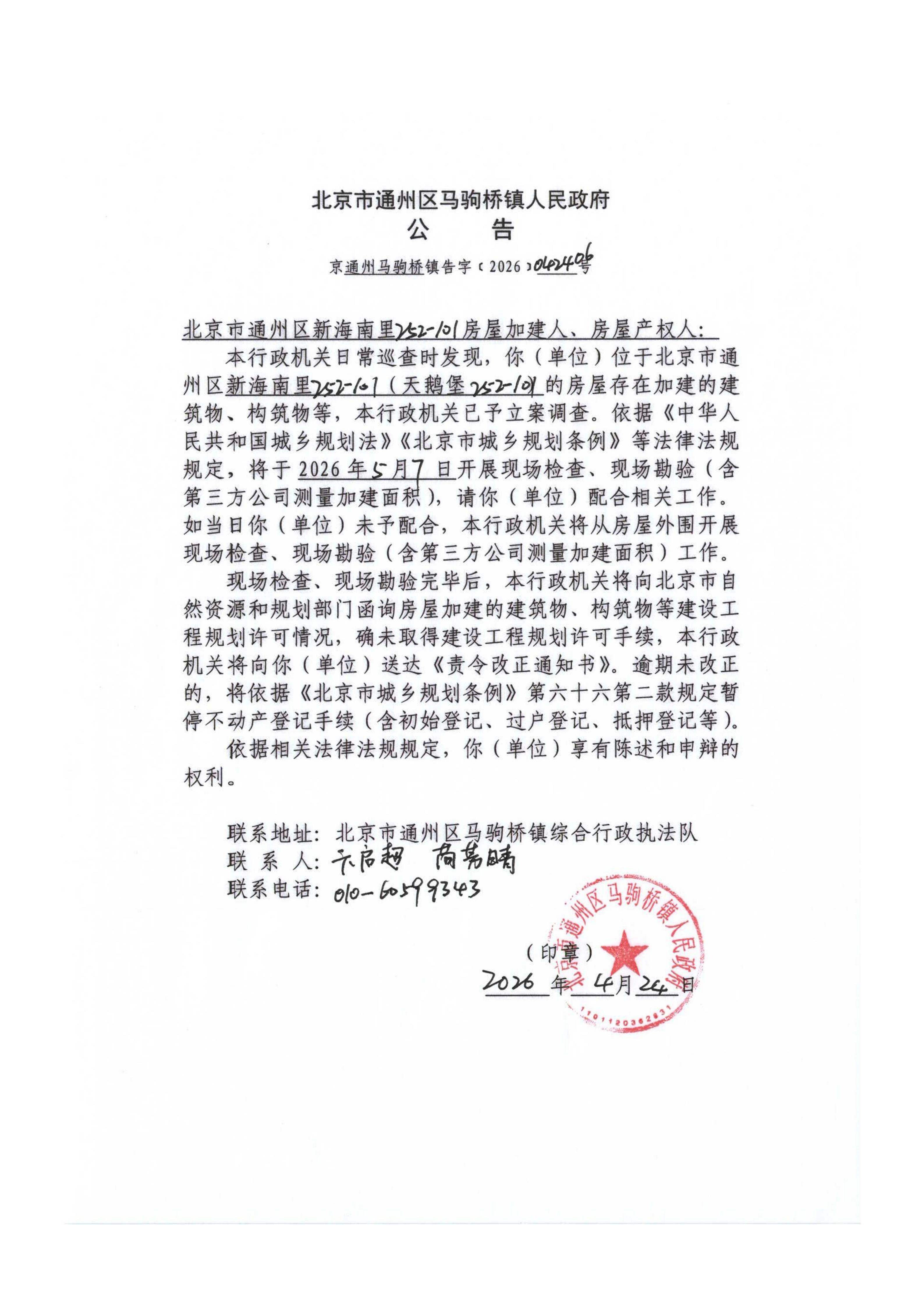 马驹桥镇人民政府关于通州区新海南里252-101房屋加建调查公告(京通州马驹桥镇告字〔2026〕042406号)